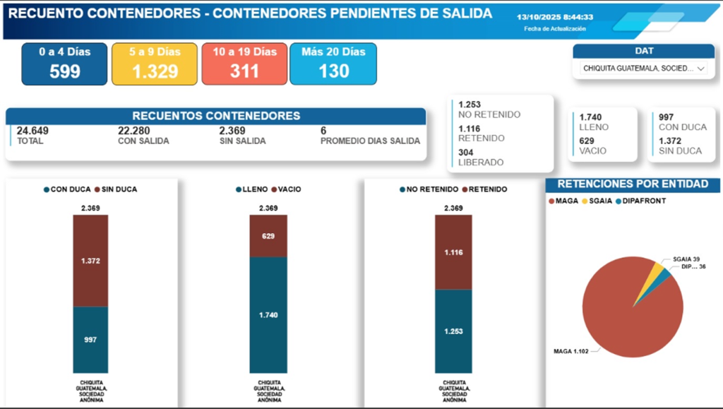 Según se observa en las siguientes gráficas compartidas por SAT existen 1,253 contenedores no retenidos que pueden evacuar inmediatamente con la gestión correspondiente.